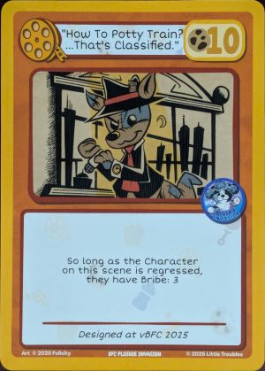 "How To Potty Train? ...That's Classified." is a Scene card introduced in the Camp BFC: Double Up! Signing Pack.