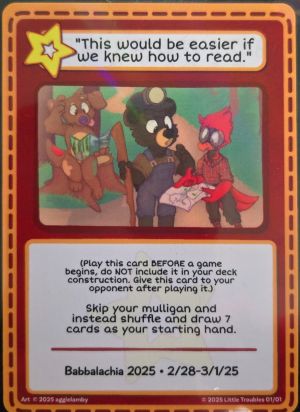 "This would be easier if we knew how to read." is a Pre-game Action card introduced in the mini set Babbalachia 2025.
