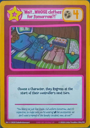 "Wait...WHOSE clothes for tomorrow?!" is a Action card introduced in the mini set Little Troubles Missed The Bus.