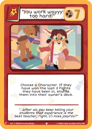 "You work wayyy too hard!" is a Storyteller exclusive Quick Action card. It was introduced in Back To (Pre)School.