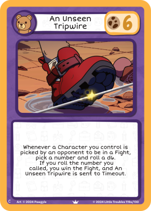 Whenever a Character you control is picked by an opponent to be in a Fight, pick a number and roll a d6. If you roll the number you called, you win the Fight, and An Unseen Tripwire is sent to Timeout.