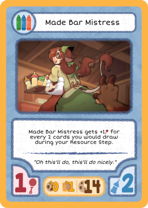 Made Bar Mistress gets +1 Confidence for every 2 cards you would draw during your Resource Step.