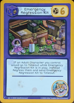 If an Adult Character you control would go to Timeout while Emergency Regression Kit is in play, instead Regress them and send Emergency Regression Kit to Timeout.