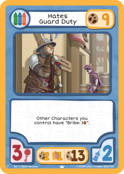 Hates Guard Duty // Still On Guard Duty is a Character card. It was introduced in the Roll For Regression set.