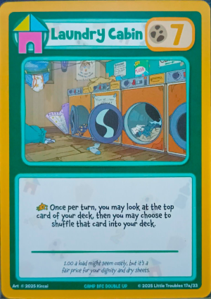 Laundry Cabin is a Field card introduced in the mini set Little Troubles Missed The Bus.