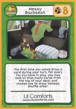 Messy Backseat is an Field card. It was introduced in the Lil Comforts mini-set.