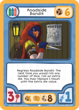 Regress Roadside Bandit: The next time you would roll any number of dice, roll and extra die. You may replace 1 result with the extra die value.