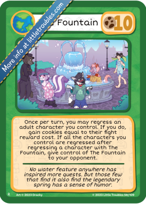 Once per turn, you may regress an adult character you control. If you do, gain cookies equal to their fight reward cost. If all the characters you control are regressed after regressing a character with The Fountain, give control of The Fountain to your opponent.