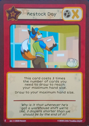 Restock Day is a Decisive Action card introduced in the mini set Lil Comforts 2: Daycare Daze.