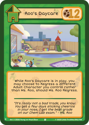 While Roo's Daycare is in play, you may choose to Regress a different Adult Character you control rather than Ms. Roo, should Ms. Roo Regress.