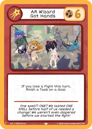 WillowBirch (talk | contribs) Created page with "{{CardStatsBasic |CardType=Quick Action |CookieCost=6 |Artist=Kircai |ImageUrl=Set3-007.jpg }} ''AR Wizard Got Hands'' is a Quick Action card. It was introduced in Roll For Regression. == Card Text == <big> If you lose a Fight this turn, finish a Task on a Goal. </big> == Flavor Text == One spell?! ONE? We lasted ONE SPELL before we needed a change! We weren't even diapered before we started the fight! == Appearances == This card app..." |