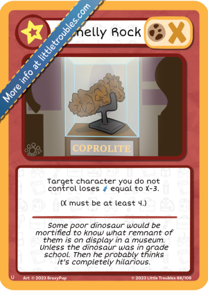Created page with "{{CardStatsBasic |CardType=Action |CookieCost=X |Rarity=Uncommon |Artist=BraxyPup |ImageUrl=Lt88.png }} ''A Smelly Rock'' is a Action card. It was introduced in the Base Set. == Card Text == <big>Target character you do not control loses Maturity equal to X-3. (X must be at least 4..</big> == Flavor Text == WIP == Appearances == This card appears in the following sets: * Base Set (88/109)" |