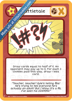 Created page with "{{CardStatsBasic |CardType=Action |CookieCost=X |Rarity=Common |Artist=Coconutcubbie |ImageUrl=Lt105.png }} ''Tattletale'' is a Action card. It was introduced in the Base Set. == Card Text == <big>Draw cards equal to half of X. An opponent may pay up to X. For each 2 cookies paid this way, draw 1 less card.</big> == Flavor Text == WIP == Appearances == This card appears in the following sets: * Base Set (105/109)" |