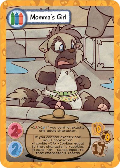 If you control exactly one adult character: +1 cookie -or- +cookies equal to that character's +cookies +1 card -or- +cards equal to that characters +cards