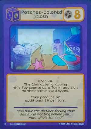 Patches-Colored Cloth is an Shiny Toy card introduced in the mini set Lil Comforts 2: Daycare Daze.