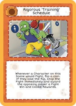 Whenever a Character on this Scene would Fight, flip a coin. If they lose the flip, stop the Fight immediately and award the opposing player a Fight Win and Cookie Rewards.